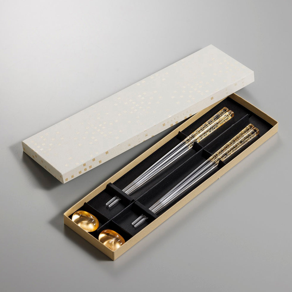 Gold and Clear set of two pairs of Chopsticks and Chopstick Rests